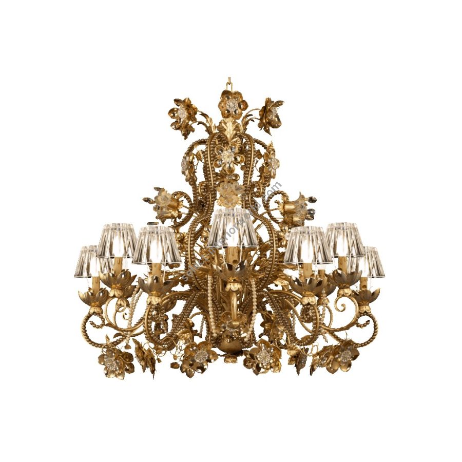 12 lights chandelier in wrought iron with clear and coloured Bohemian crystal, Murano glass, crystal pearl banding, porcelain and crystal lamp shade