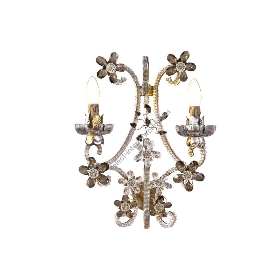 2 lights wall lamp in wrought iron with clear and colored Bohemian crystal and clear pearl banding and Bohemian strip