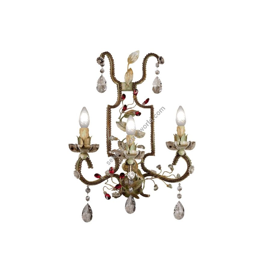 3 lights wall lamp in wrought iron with clear and colored Bohemian crystal