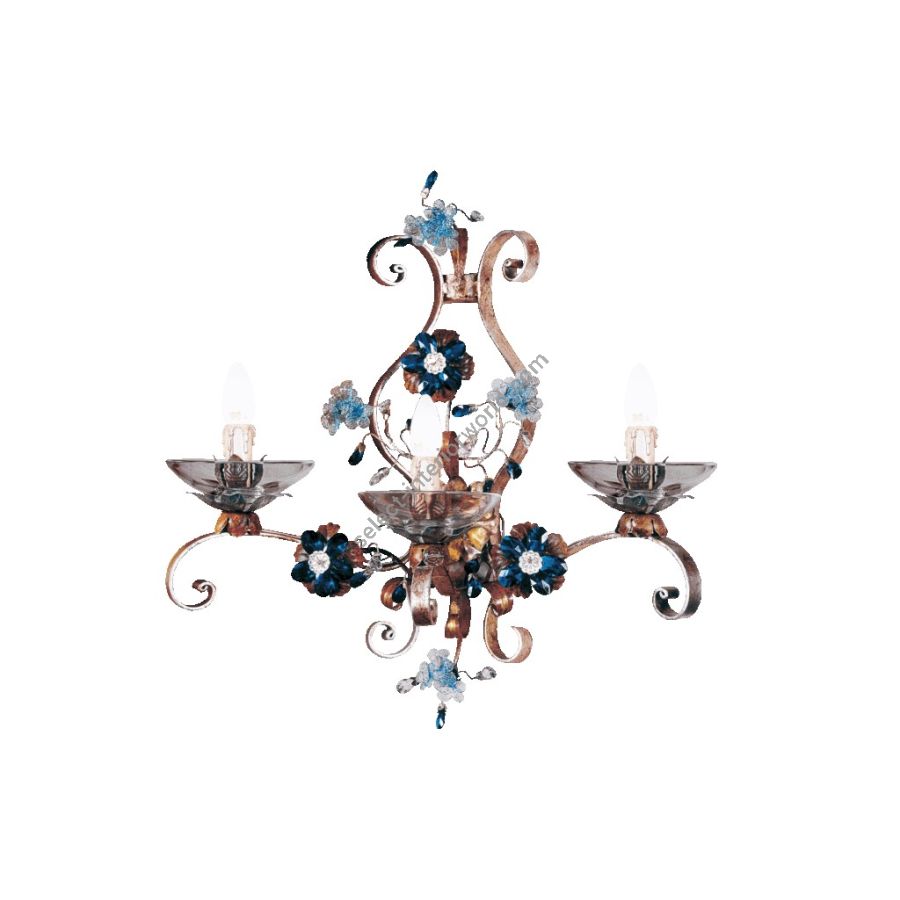 3 lights wall lamp in wrought iron with clear and colored Bohemian crystal and Murano glass
