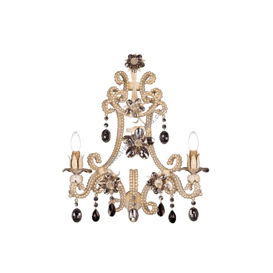 2 lights wall lamp in wrought iron with clear and coloured Bohemian crystal, Murano glass and colored pearl banding