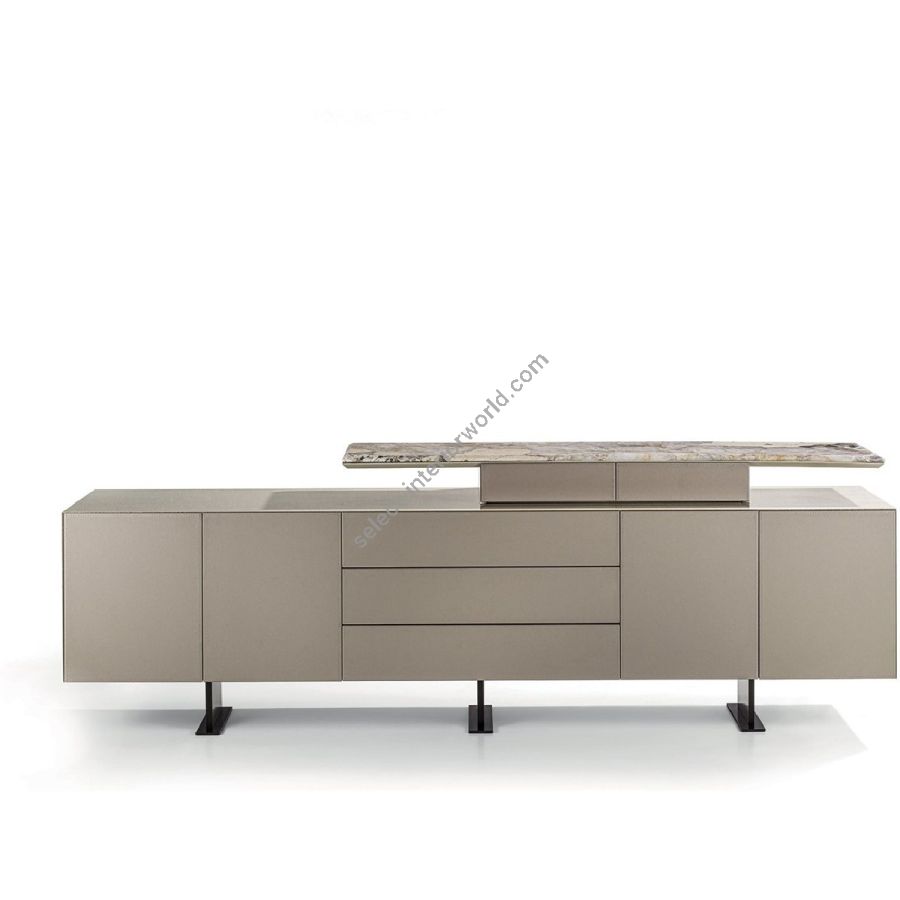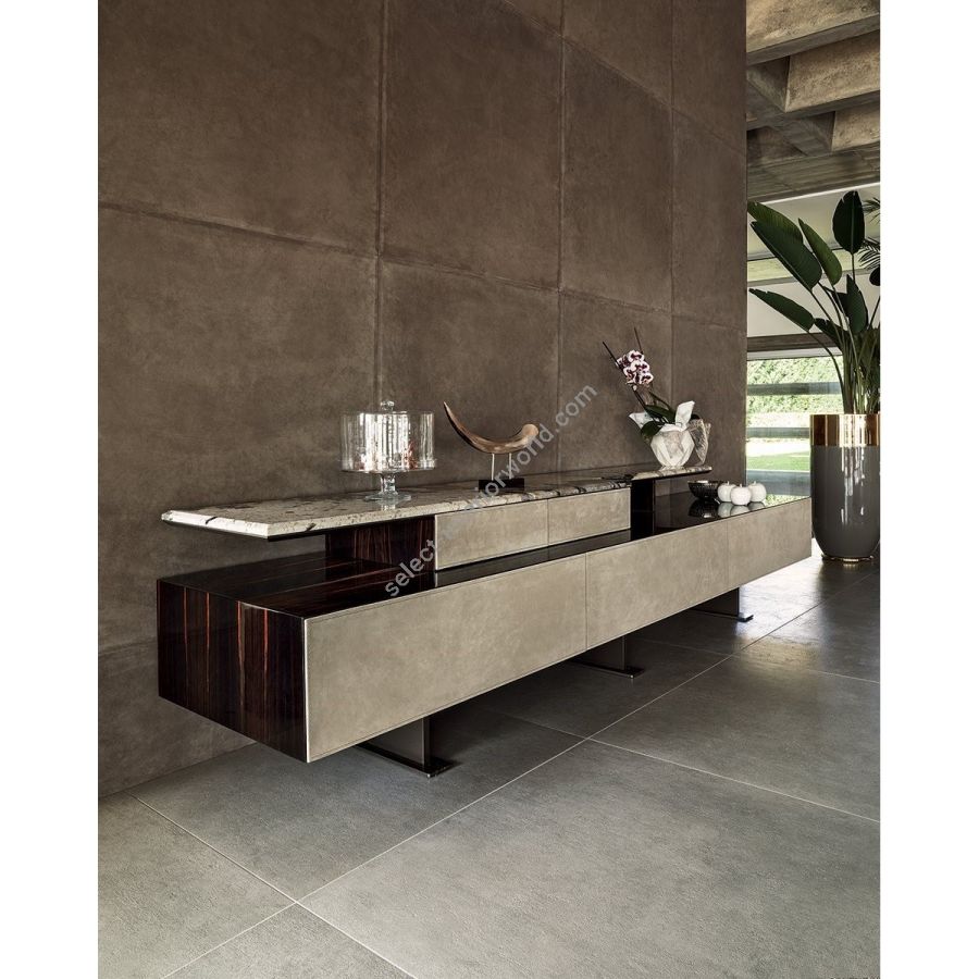 Collection of living room cabinets available in two heights, made up of a storage element with doors anddrawers (the low variant comes with drawers only) and a shelf set on 2 small drawers. Base in aluminium painted bronze. Sides and top in wood: glossy/matt Maple, glossy/matt heat-treated Eucalyptus, glossy/matt Sycamore frisè, glossy/matt Ebony, glossy/matt Canaletto walnut or glossy lacquered wood in coloursfrom the range. Drawer fronts upholstered in leathers from the catalogue. Shelf in the finishes: bronze or smoky mirror. Marble: White Carrara marble, Imperial Brown marble, Portoro marble (divided into 2 pcs.), Sahara Noir marble (polyester finish), Dover White marble, Panda White marble,Guatemala Green marble, Corteccia marble, Port Saint Laurent marble, Red Levanto marble, Bardiglio Nuvolato marble, Elegant Brown marble, Shale Rosewood marble, Emperador Dark marble, Silver Wave marble, Agatha Black marble, Frappuccino marble, Calacatta marble, Fusion Light marble, Patagonia marble,Explosion Blu marble, Fusion Multicolor marble, Juliet quartz marble. Push-pull opening. Interiors are lacquered in matt bronze.