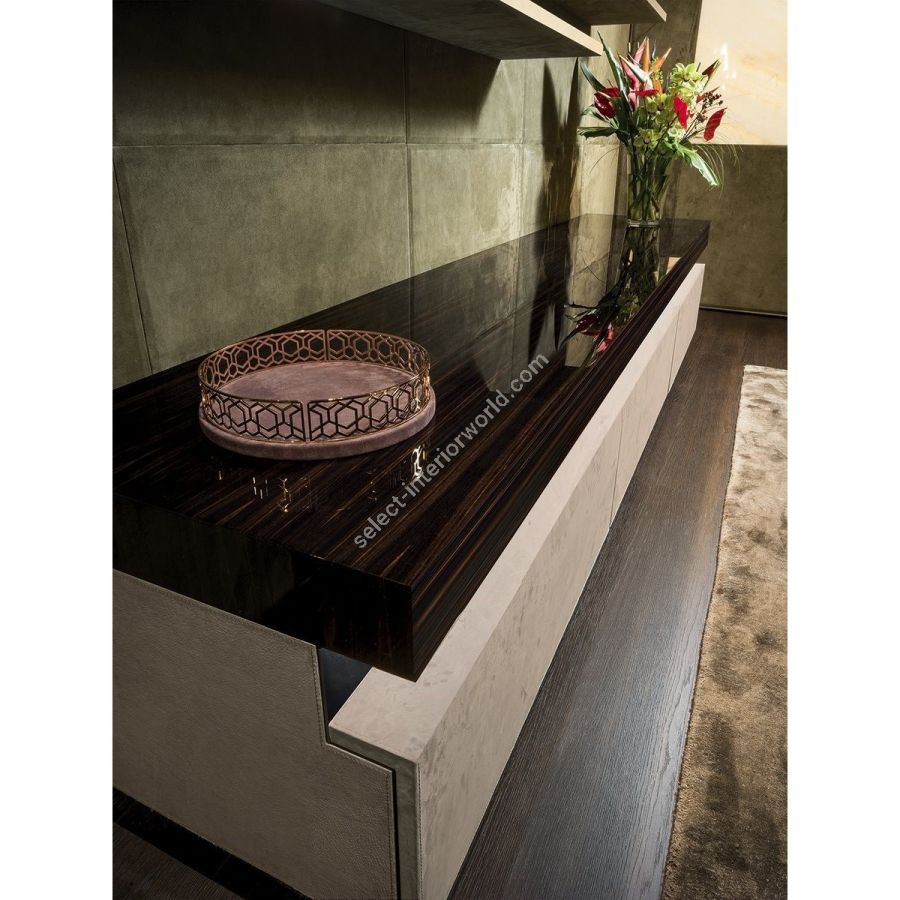 Modular system of living room containers, made up of large removable wooden drawers in the finishes:glossy/matt Maple, glossy/matt heat-treated Eucalyptus, glossy/matt ebony, glossy/matt Canaletto walnut, glossy/matt Sycamore frisè, glossy walnut burl wood, glossy lacquered wood in colours from the range.Or entirely upholstered in leather. The base is made up of metal legs painted bronze. Push-pull openingmechanism and internal groove in the drawer in ground metal in the finishes: Satin nickel, bright shaded brown, Black Rose gold, bright pink gold, matt pink gold, bright light gold, matt Champagne gold, bright chrome, bright black chrome, matt satined bronze. Dimmer-switched LED lighting with touch switch in interior groove Interior painted bronze and drawer unit bottom in Cat P.3 Miami/SoftLeather/Suede leather. Top in wood or in box shaped marble 10 cm: White Carrara marble, Imperial Brown marble, Dover White marble, Panda White marble, Corteccia marble, Port Saint Laurent marble, Red Levanto marble, BardiglioNuvolato marble, Elegant Brown marble, Shale Rosewood marble, Emperador Dark marble, Silver Wave marble, Agatha Black marble, Frappuccino marble, Calacatta marble, Fusion Light marble, Patagonia marble, Explosion Blu marble,Fusion Multicolor marble. To diversify modularity, the system offers 3 types of internal outfitting toplace in the drawer unit: a large drawer with a removable tray, a large drawer with an sliding shelf, a large drawer with two smaller drawers on the top. Another option is to add a 50 cm high back raise in marble with dimmer-switched LED lighting with touch switch. The effect is like a beam of light illuminating the wall.