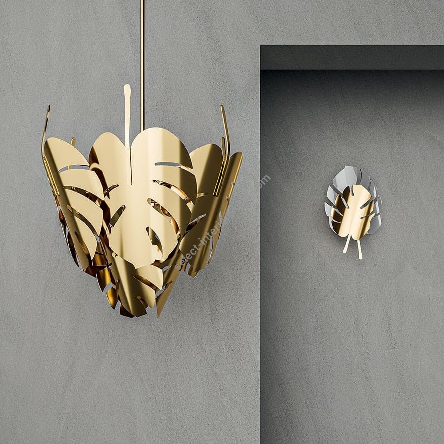 A metal structure in galvanic gold enriched with precious stylized leaves and available in galvanic gold or satin crystal glass.