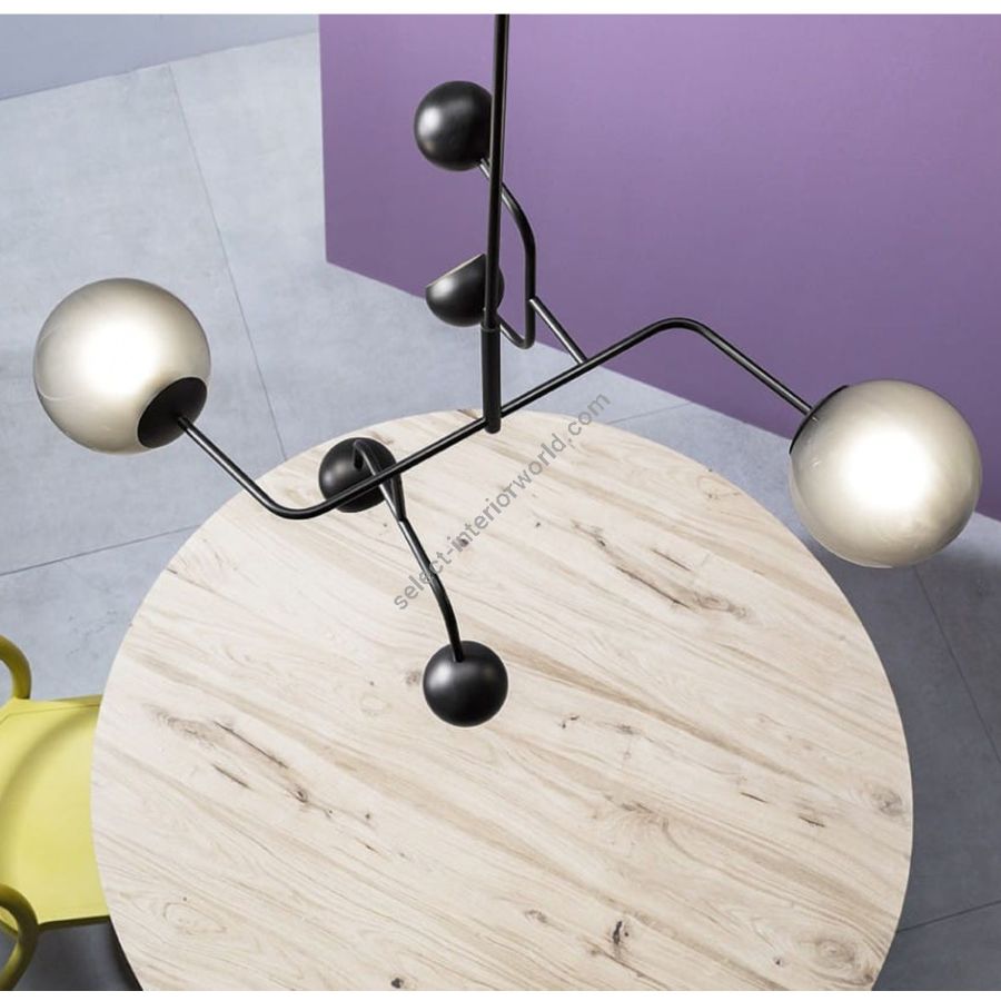 Chill evokes the fluid and simple lines of art and design, where graphics blend with simplicity of form. The structures in opaque painted metal, support metal spheres with directional Led lighting and Murano blown glass boule that allow different modes of lighting, diffused and punctual.