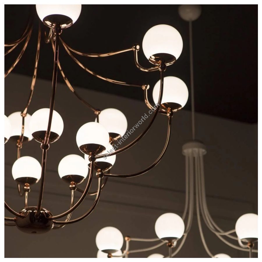 This chandelier is the new interpretation of our Luna lighting presented in early 2000s, aiming at semplicity and removing every redundant elements. Only the “soul” of Luna has been left intact, emphatizing its junctions and glass shades to get a balanced image.