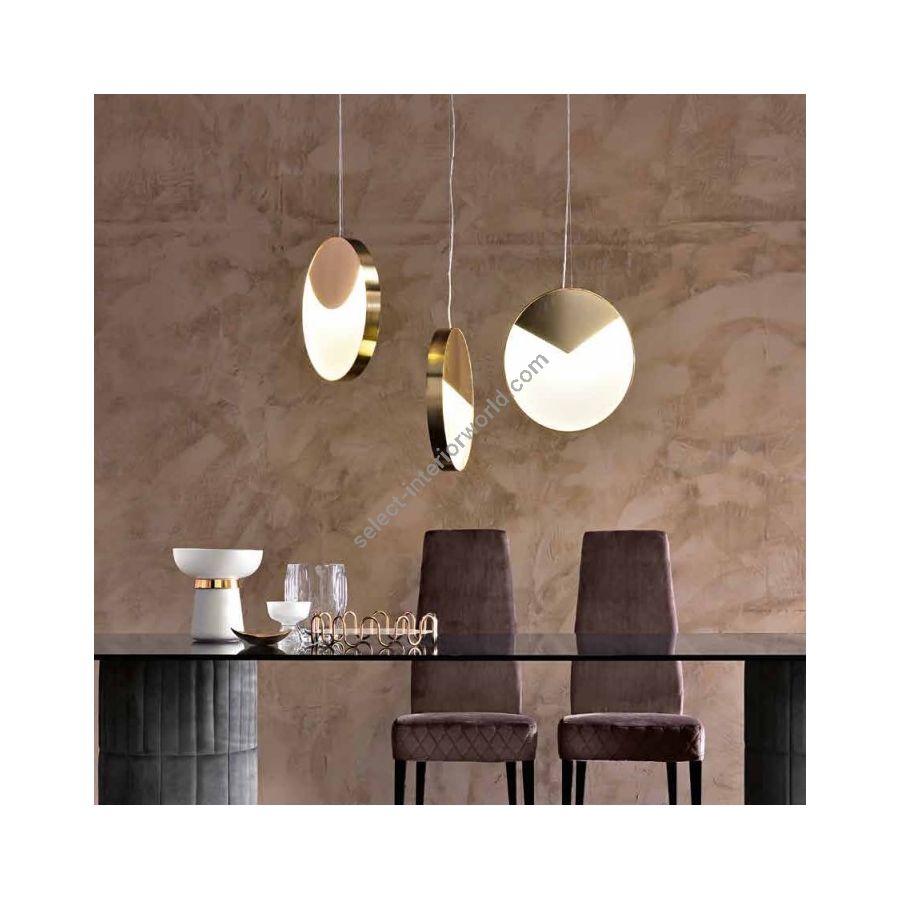 Moonlight is a collection of lamps with strong graphics. Small pre-formed metal sheets, attached to the structure with magnets, allow each lamp to be personalized, creating unique pieces. The Moonlight lamps are available in two diameters: 40 cm and 30 cm. Two finishes are offered: V0199 matt black or V2805 satin brass. Thanks to an intelligent production system, they are very versatile and can be used either as ceiling, wall or hanging lamps.