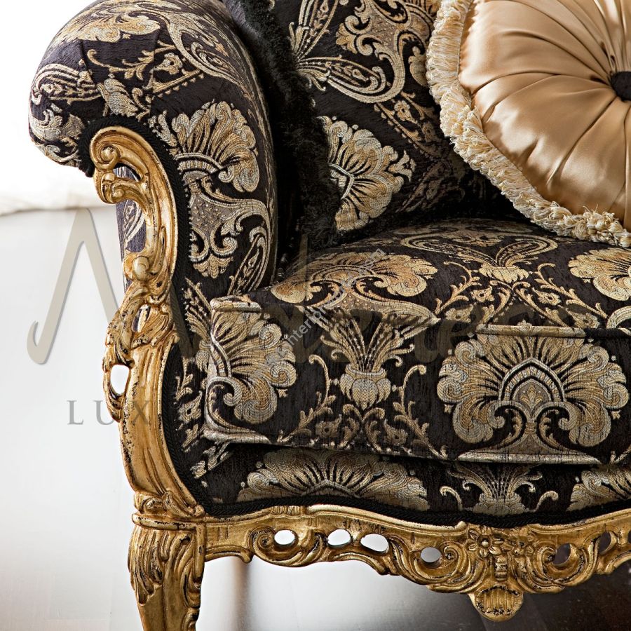 Specially designed armchairs take on a neo-baroque style. This accent furniture is a great head turner piece in any living space. An eye-catching black-gold upholstered fabric part of the unique collection of Modenese. Against the charismatic golden finished on the handcrafted wooden motif in an intricate curl. A great fit for the modern luxury residence settings.