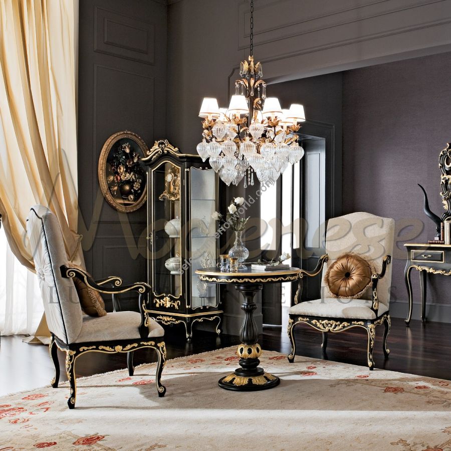 A glimpse to the past, with handcrafted luxury pieces of timeless rococo beauty. An elegant upholstered seating gracefully on top of the contrast black painted carving wooden frame. Beautiful golden decorative details carefully added as intricate accessories to the black frame. This piece of furniture easily brings an elegant touch to your luxury decor scheme. Fabric choice and wooden frame colours can be customised in different options upon request.