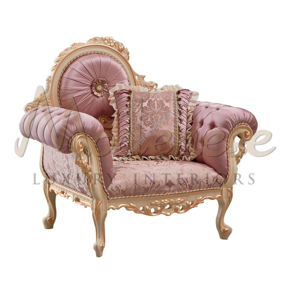 An elegant victorian upholstered armchair from Italian artisans is a type of chair that features a classic and ornate design inspired by the Victorian era. It is typically upholstered in luxurious fabrics such as velvet or brocade and may feature decorative details such as tufting, nailhead trim, or carved wood accents. The armrests of this type of armchair are usually curved and padded, providing support and comfort to the arms while sitting. The backrest is typically tall and may be slightly curved to provide additional support to the neck and shoulders.