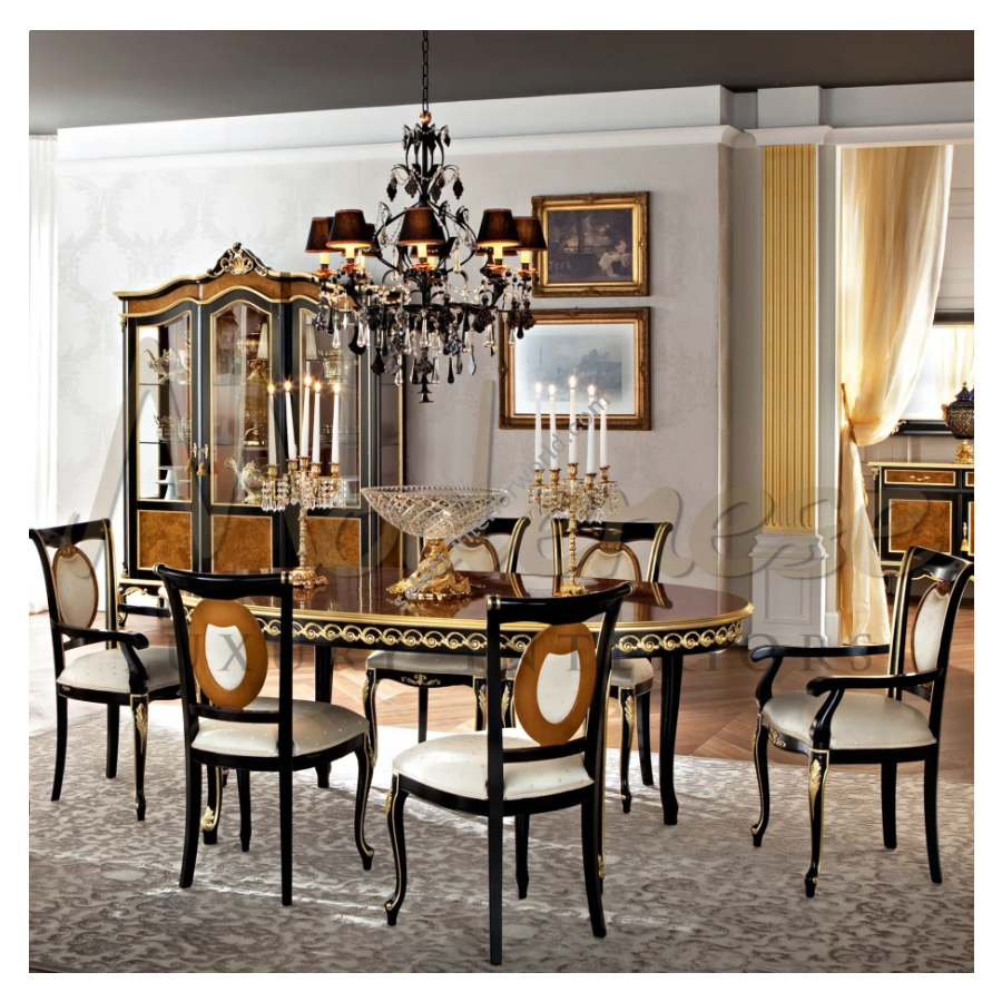 | Finish: | Black lacquered finishing, gold leaf details. Seat back detail: light cherry wood finishing |