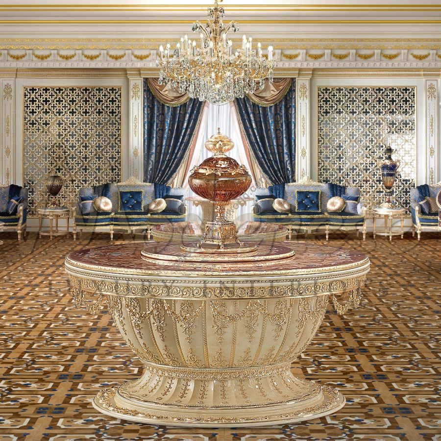Impress your guests with this ravishing round table featuring an up-down lifting mechanism by Modenese Interiors. Ideal for ceremonies and parties, this piece of furniture is undoubtedly unique and ostentative. Besides the wonders of the mechanism, the table surfaces are decorated with a complex inlaid pattern and the structure is realized in solid wood.
