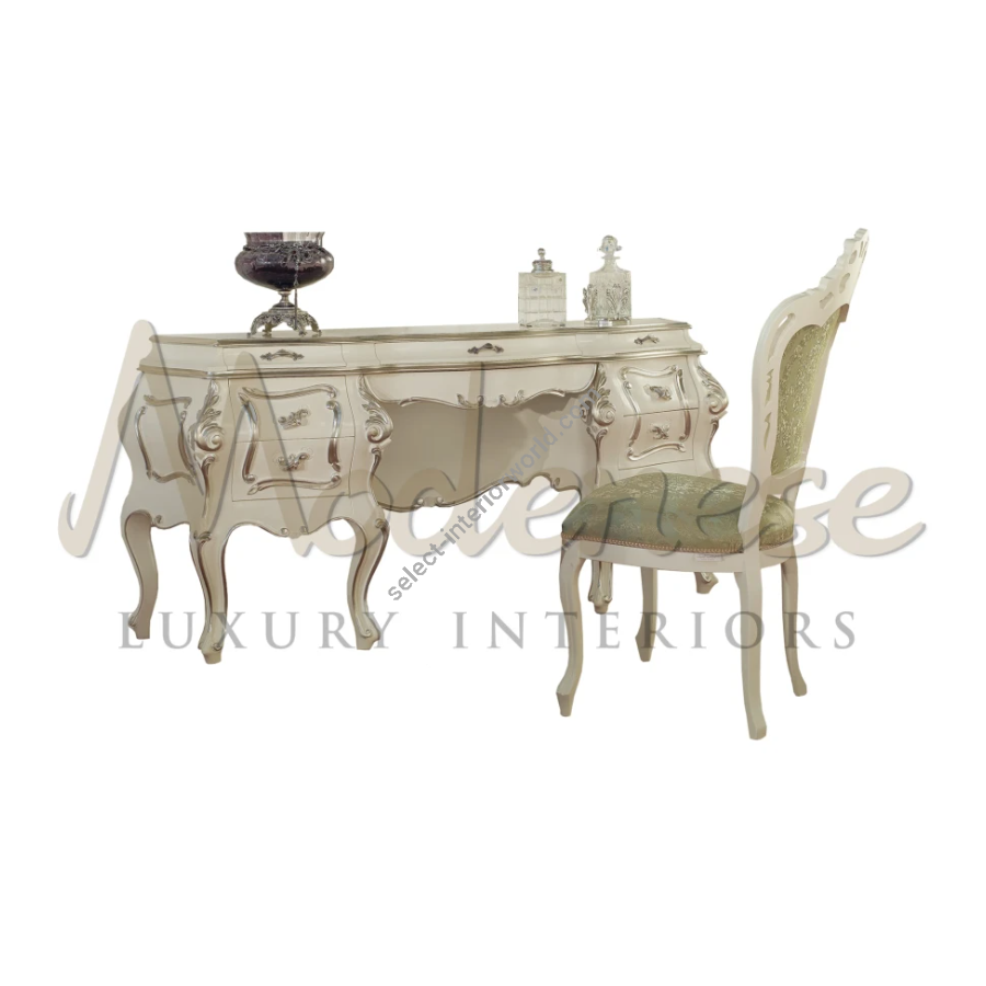 Elegant and majestic white lacquered vanity unit with silver leaf detailed carvings. Wonderfully designed knobs and shape. Modenese Furniture, Italian brand, can also act as a partner for your interior design projects by providing you with planning assistance, bespoke furniture realization and operative installation. This item is usually located in bedrooms and matched with chairs, armchairs, wardrobes, commodes and beds.