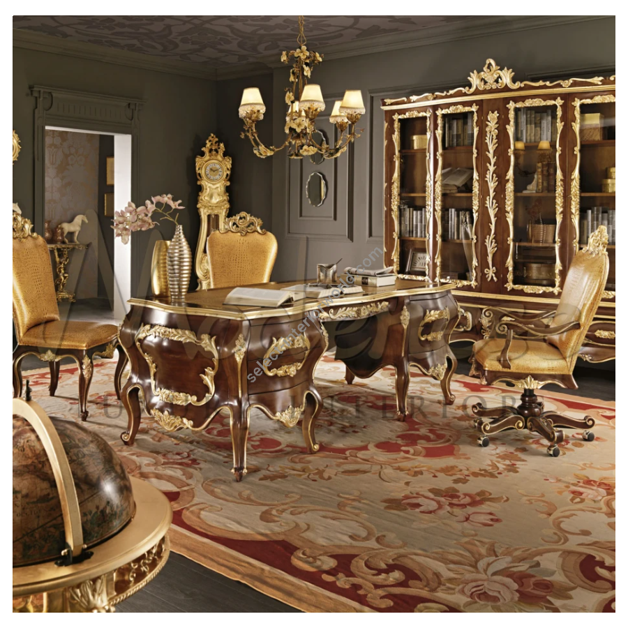 This Modenese Furniture swivel armchair has been designed and produced for top managers and company owners. its unique authority and quality materials represents the perfect solution for leading figures. The armchair structure is made of top-level solid wood finish in patinated walnut and decorated in gold leaf.