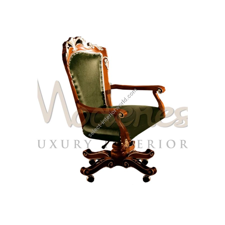 This Modenese Furniture swivel armchair has been specifically conceived for executive offices. This product, composed by a solid wooden structure in patinated cherry wood finishing, decorated with silver leaf details, and upholstered with genuine leather represents the perfect solution for top managers' premium offices.