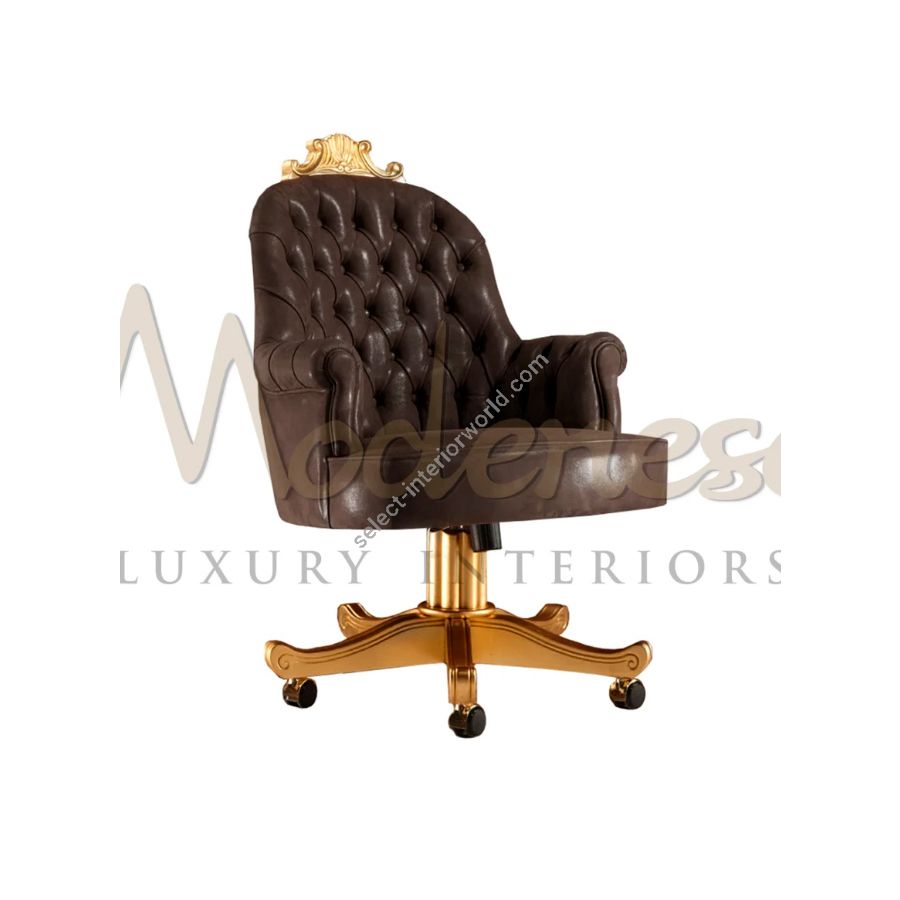 A great functionality that comes with sophistication is the result of this leather swivel armchair. The craftsman work is highlighted here by patinated gold leaf details with whole seating has covered with leather and finished with capitonné stitch. The colour choice can be altered upon requested.