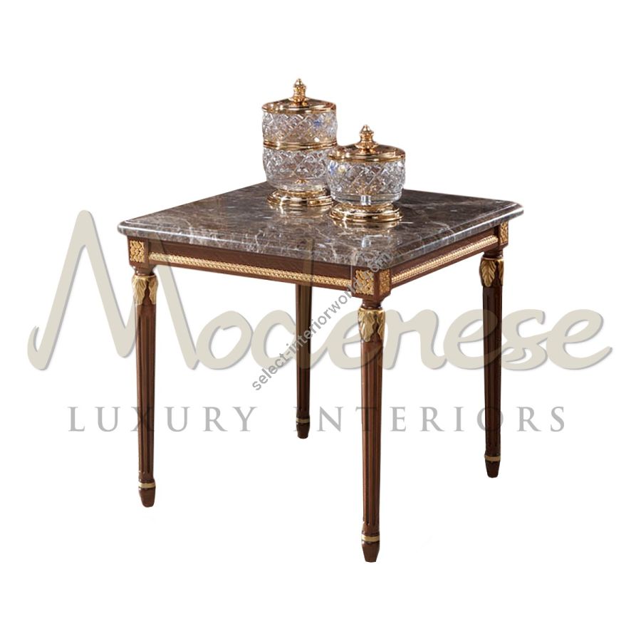 Enjoy the real Made in Italy luxury lifestyle with this hand-decorated square side table. Emperador Dark marble top, solid empire-style wooden structure hand decorated in walnut finish and gold leaf details.