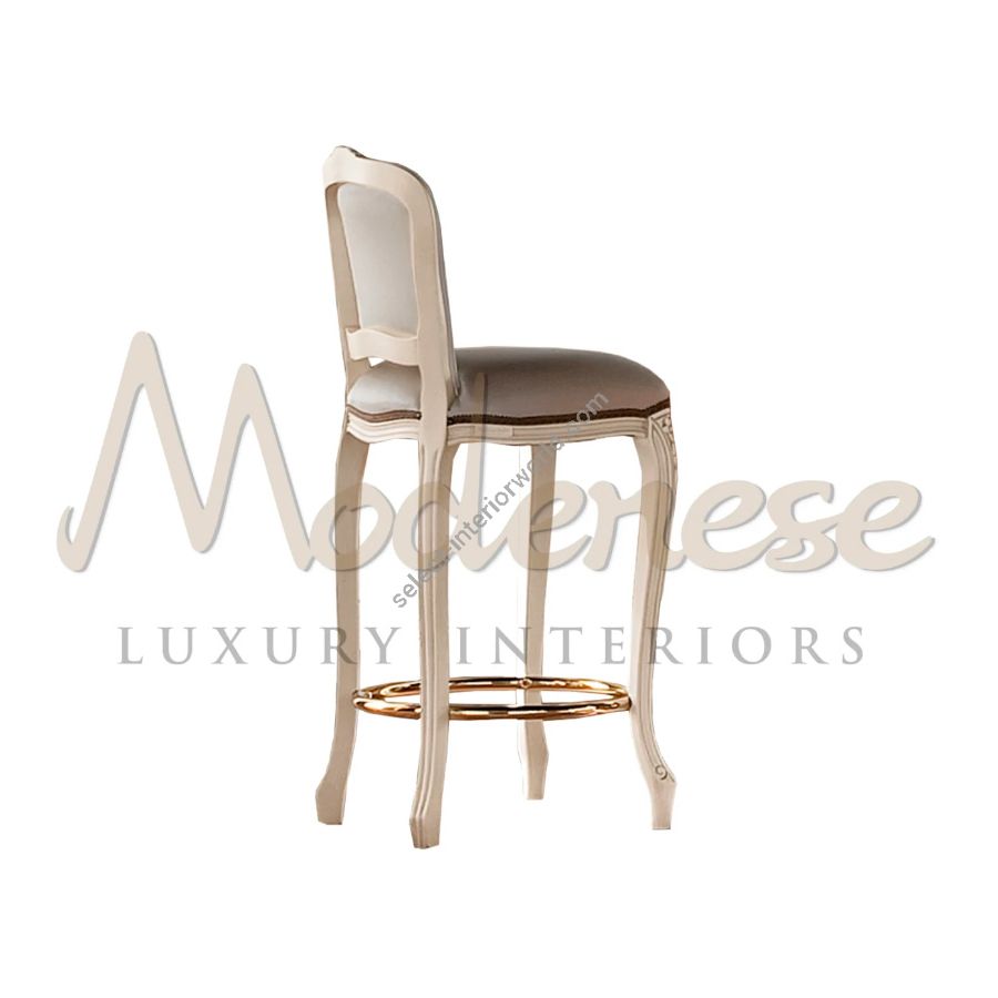 Lavish neoclassical bar stool in patinated ivory finishing and grey fabric upholstery both in the seating and in the backrest, featuring a golden metal round frame. This seating element, which goes best with the Modenese Home Bar set, can be completely customized according to your private residence project.