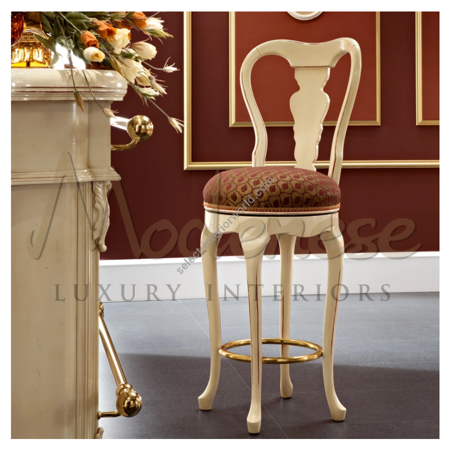 Elegant victorian bar stool in bright ivory finish, red upholstery and golden metal footrest. This seating element, which pairs with the Modenese Home Bar set, is thoughtfully hand-carved and ideal in lounge penthouses and secluded residences. Ask Modenese Interiors for a design consultancy.