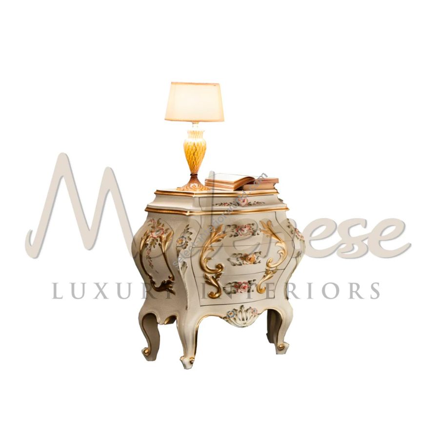 21st Century magnificently bombed night stand from Modenese Furniture. This little treasure in solid wood presents custom rose-shaped knobs with hand painted flower decoration on carvings. Drawers with Blumotion system and gold leaf details. Goes well into interior design projects including bedroom furniture such as cabinets, vanities, armchairs and wardrobes.