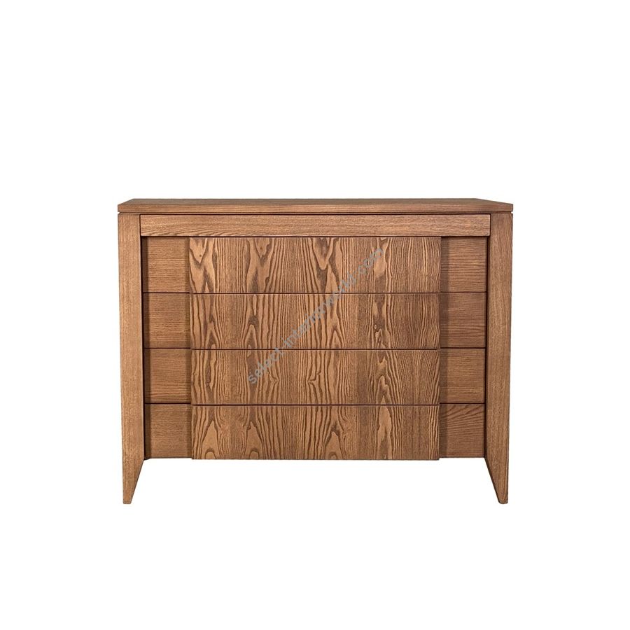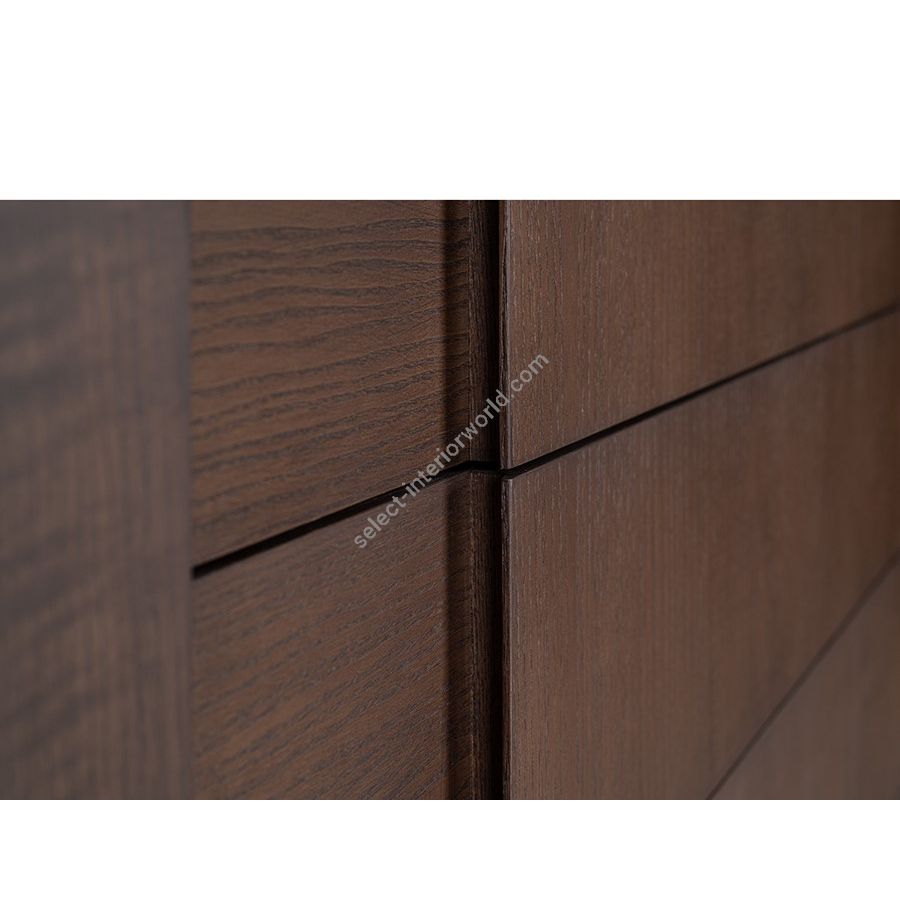 The natural wood grain decorates the Anerio chest of drawers and bedside table; the contrast in the wood grain is exalted by the peculiar shape of the front panels of the drawers.