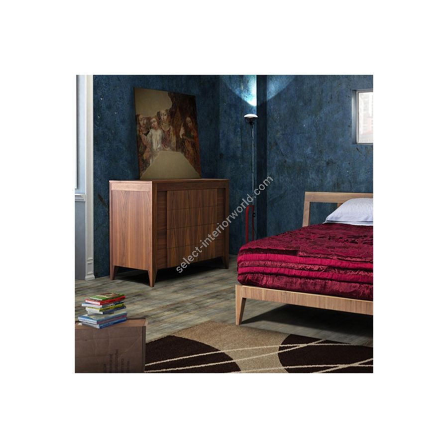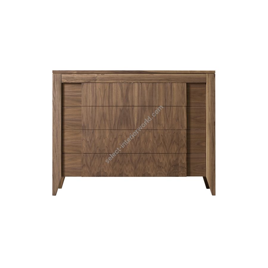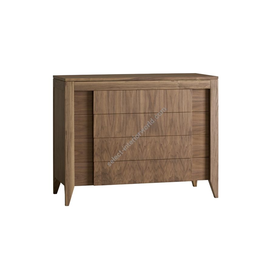 Chest of drawers made of canaletto walnut wood with 4 drawers and 1 hidden drawer under the top. Drawer fronts with opposed grain and different reliefs. The natural wood grain decorates the Anerio chest of drawers and bedside table; the contrast in the wood grain is exalted by the peculiar shape of the front panels of the drawers.