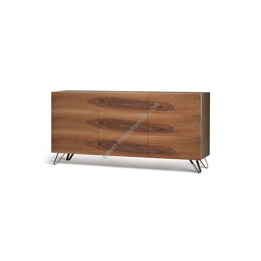 Sideboard made of ash wood, 3 doors finely veneered with walnut. Colorful interior with adjustable shelves and 3 drawers in the central compartment. Steel feet. Natural walnut decorates in a natural way the doors of the Sherwood, a spacious sideboard designed by Maurizio Duranti. The Sherwood at first sight appears imposing and serious, but inside it hides an unexpected twist. The color, available in different varieties, becomes the unquestioned star of this precious creatively designed sideboard, which can be customized.