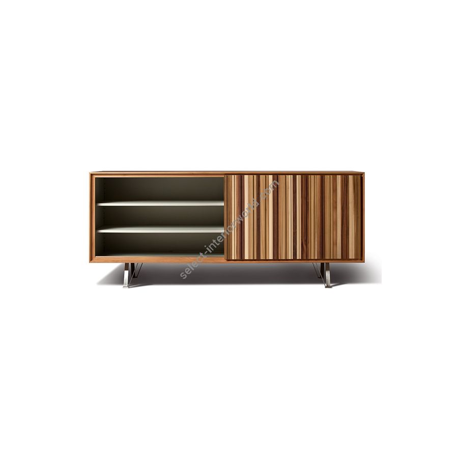 Sideboard made of cherry wood with 1 "Code" sliding door, 2 internal adjustable shelves and 3 drawers with push&pull mechanism and Canaletto walnut front. Upon request structure in canaletto walnut. Sipario introduces the sliding door to the sideboard. By using different wood types for the lists of wood on the door an interesting and balanced movement is created. The internal space has been cleverly divided in drawers, with a precious walnut panel and a large open space with adjustable shelves.