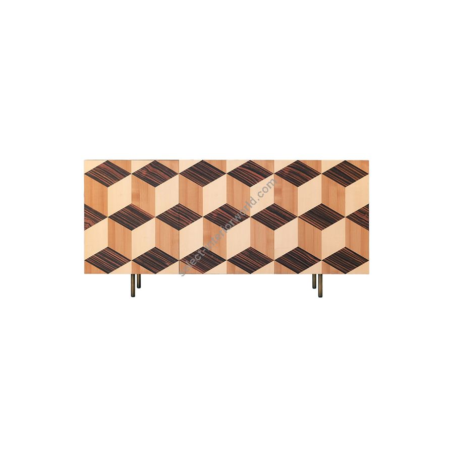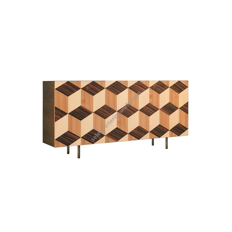Sideboard made of ash wood and doors with maple, walnut and ebony. Cubic prospetive inlay is a craft firstly developed in Verona since XV century. Colored interior with 3 central drawers. Brass feet. This new sideboard, designed by the MAAM research center, is made of different wood types, which give the model a timeless elegance and style. The frame structure is made of ash wood and the doors have an inlay of maple, walnut and ebony, which create a perspective effect of great visual impact.Inlay with a cubic perspective was used especially for floors already in the 15th century. This form of art first developed in the Verona area and then spread to Venice and has now found new life with the Verona Sideboard. The internal spaces have a colored stain and 3 handy drawers in the central part. The brass feet give the piece lightness and an elegant touch.