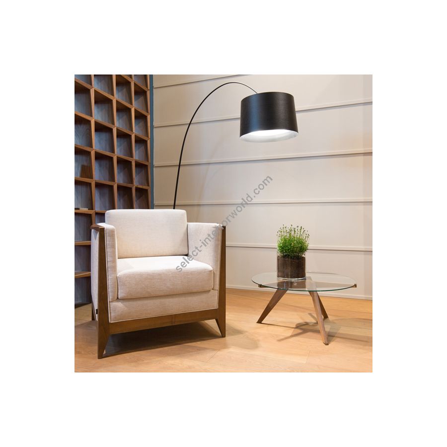 Boomerang is an elegant round coffee table, with three legs. Peculiar tail joints are used to assemble the legs. They are visible under its glass top.