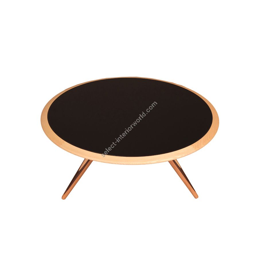 Coffee table with round ash wood top and glass insert. Turned legs in the shape of biliard cues made of cherry, wengè and maple. Customizable top finish, with central glass insert upon request.