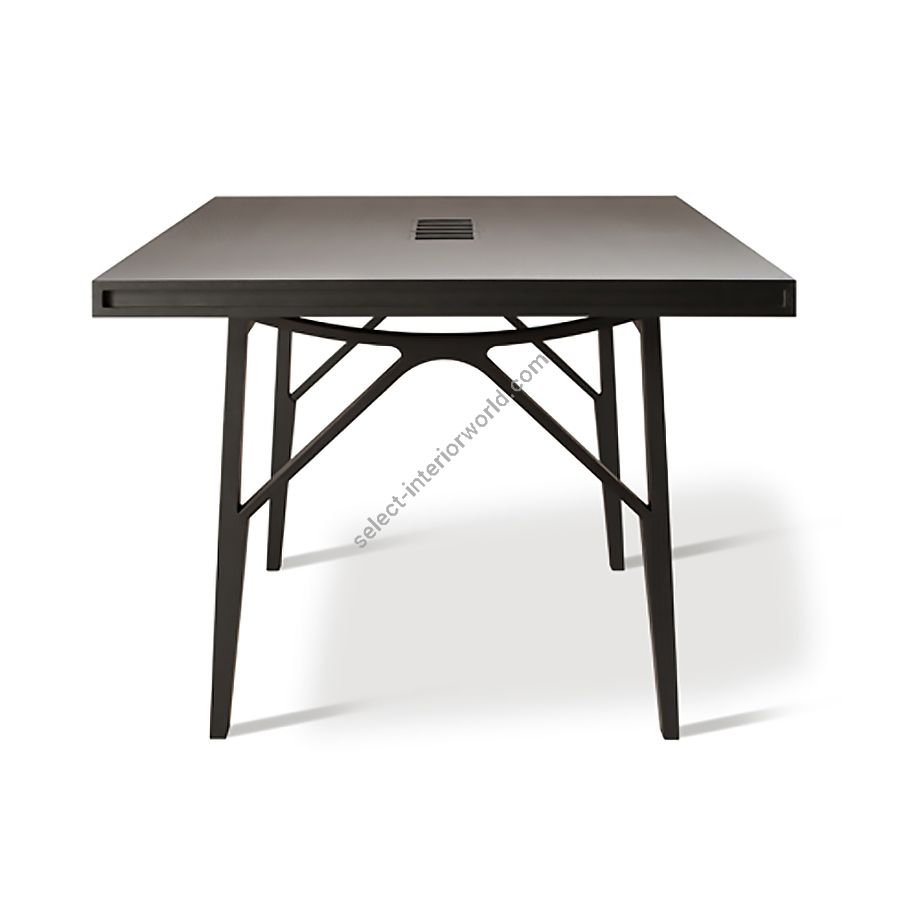 Table made of ash wood with fork shaped legs, and table top with veneer pattern decoration. In the middle 5 removable trays. The designer Franco Poli has designed a new and original table for Morelato. The Campo is characterized by a severe geometry of forms, contrasted by the natural movement of the ash wood of which the table is entirely made, as you the tabletop clearly shows. Supported by special fork shaped legs, the Campo can be used both as a table and as a spacious desk with five removable tray in the center of the top.