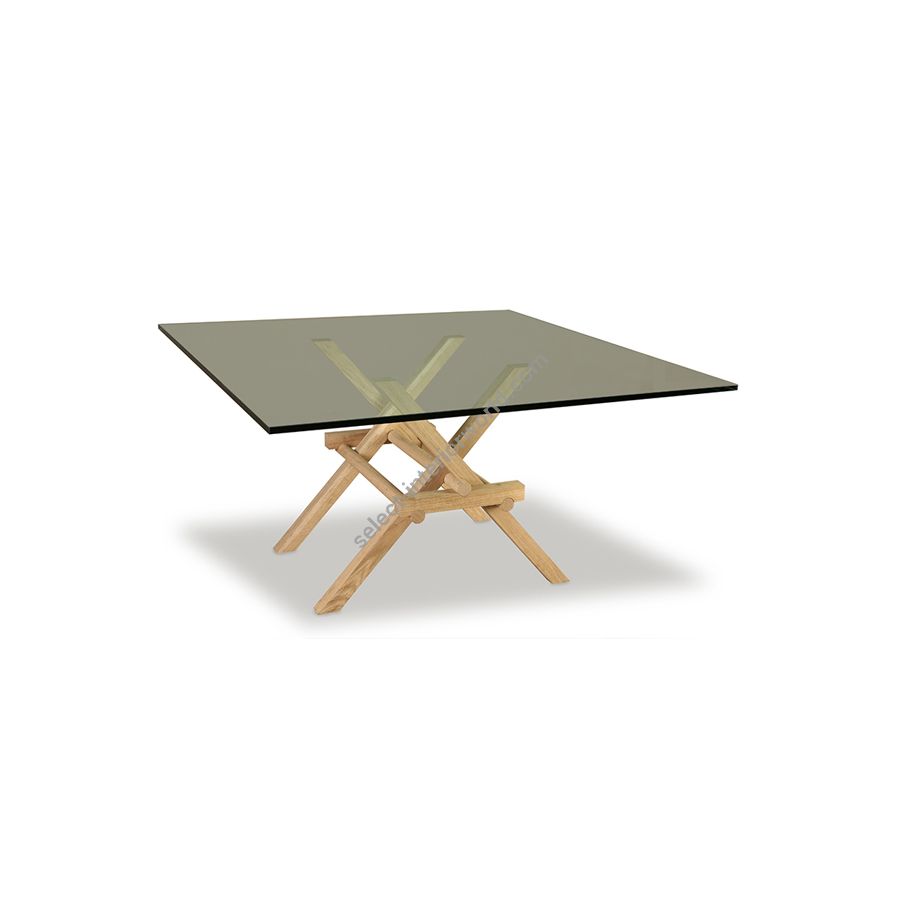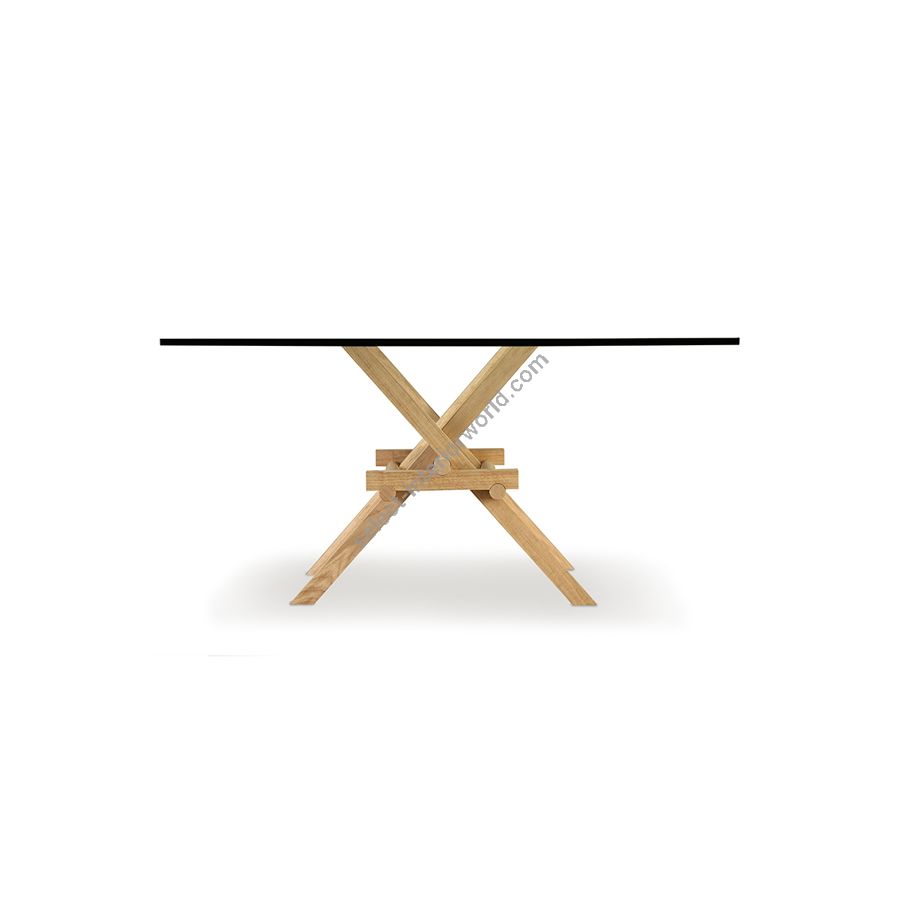 Table made of solid ash with glass top. The joint of the legs, without any screws or metal joints, is inspired by the construction of movable bridges of Leonardo da Vinci. Inspired by Leonardo Da Vinci’s the mobile bridges, Marco Ferreri has created Leonardo: a unique square table. The central leg, made of solid ash wood, makes it unique thanks to the skillful combination of joints, which support the precious top. Available in different models with glass top or made of ash wood, Leonardo is a perfect example of applied cabinet-architecture.