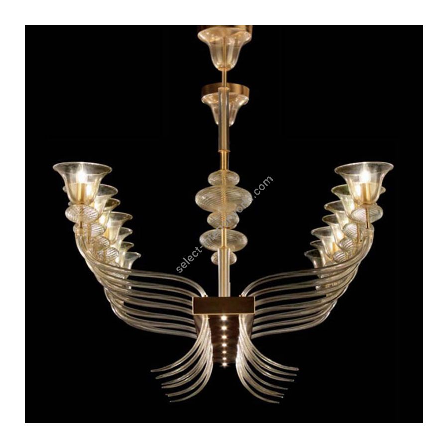 In the catalogue we propose Cellini in gold colour: pure brushed gold for the structure and mottled golden glass. A precious and yet delicate chandelier, that can embellish the whole surrounding space. Cellini, with its 14 lights, is the ideal solution to enlighten wide rectangular rooms.