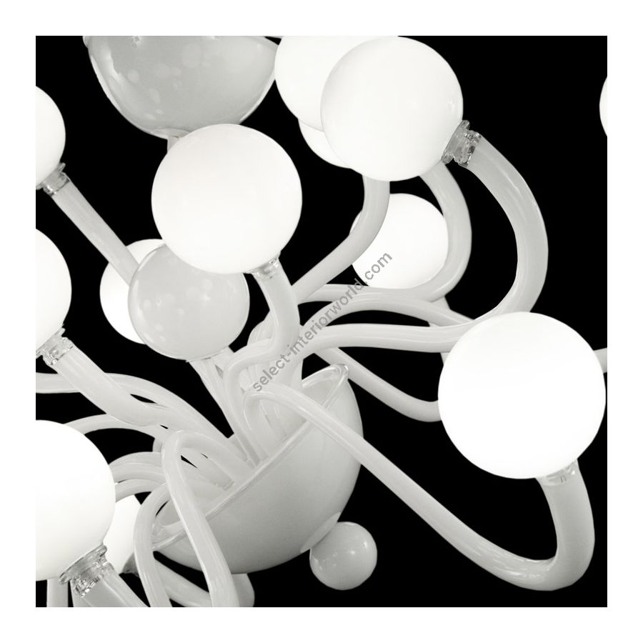 Dadaumpa is suggested in the catalogue in a milky white colour tone, but it can be customized choosing from a vast range of colours, both transparent and opaque. This chandelier in artistic glass gives its best if inserted in wide environments, that better enhance its magnificent structure with a great number of lights.