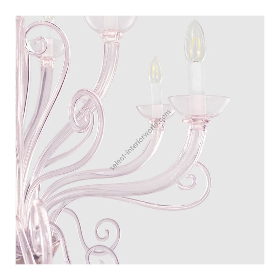 Melisanda is a venetian glass chandelier characterized by a romantic and delicate pink shade. The bottom bowl with a perfect semicircular shape collects all the elements of the chandelier. The arms have different forms and heights and fully surround the central column. The spaces between the arms are filled up with pastoral elements in different shapes. The bobeches have been resized in order not to compromise the overall harmony of the lighting creation. In our catalogue this Venetian glass chandelier is recommended in a delicate lilac shade which perfectly suits its sweet aspect.