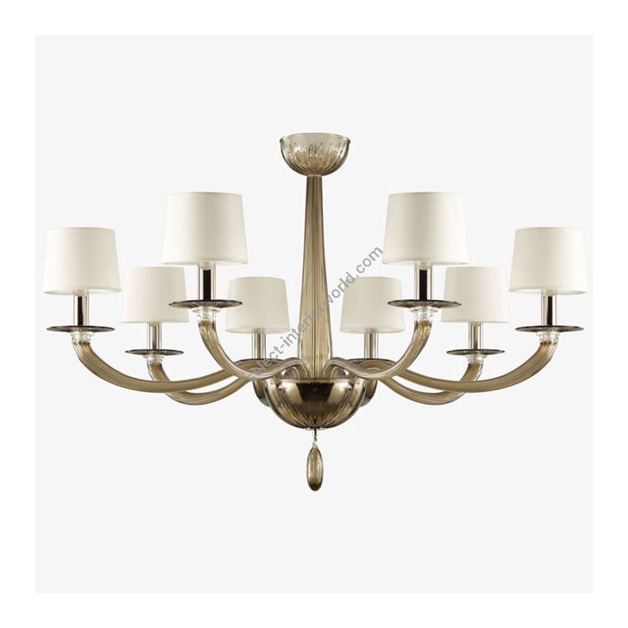 The candle cups have been substituted with simple handmade two-dimensional elements. Serenade has been stripped of any decorative element. The only exception is the elliptical, olive-shaped pendant which is hanged to the bottom bowl. The "rigadin" technique, used for all glass parts in a delicate way, embellishes this lighting creation. Refined artisanal lampshades in cotton complete the composition of this Murano glass chandelier.