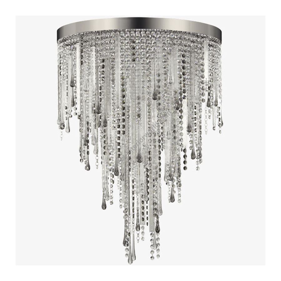 The light, that comes out passing through the pendant elements, creates a multitude of glares in the surrounding space. This is a real jewel-like chandelier, completely covered by tiny Murano glass and crystal elements. This elements have been fixed on a neutral structure that disappear below the cascade of decorations.