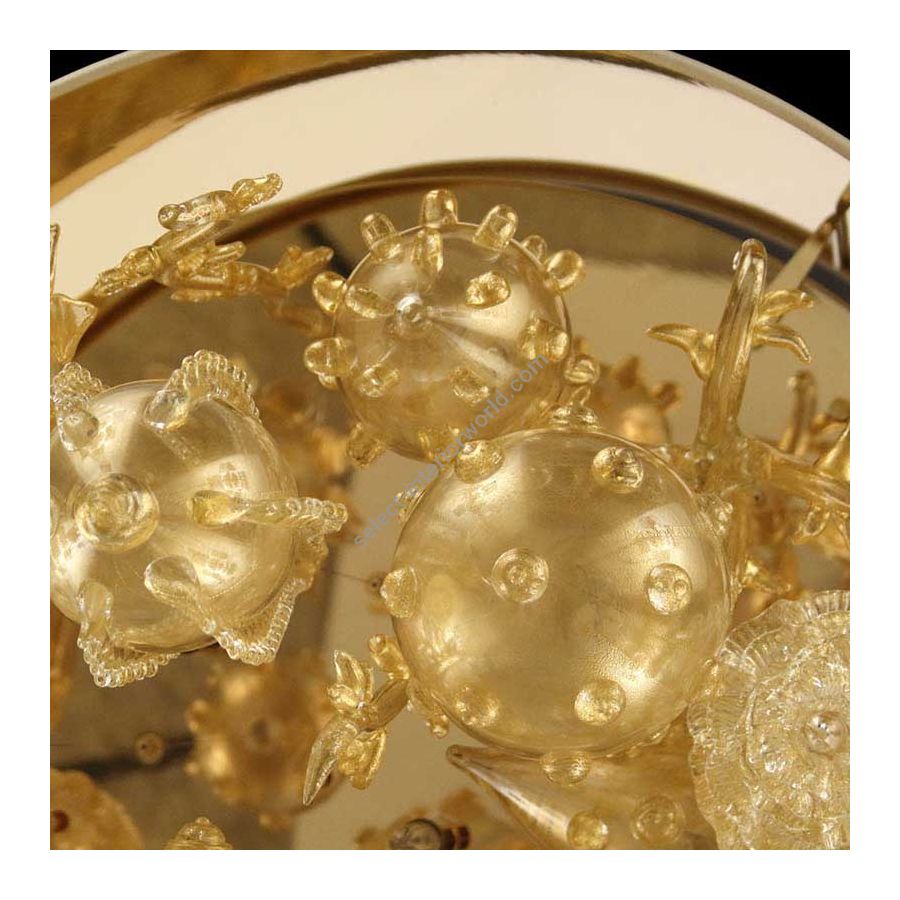 The decorations are composed of a series of drop-shaped blown glass elements decorated with “morrise”, “morelline” and other decorations. The light that comes from inside the lampshade illuminates from above the underlying decorations; this make the composition even more fascinating.