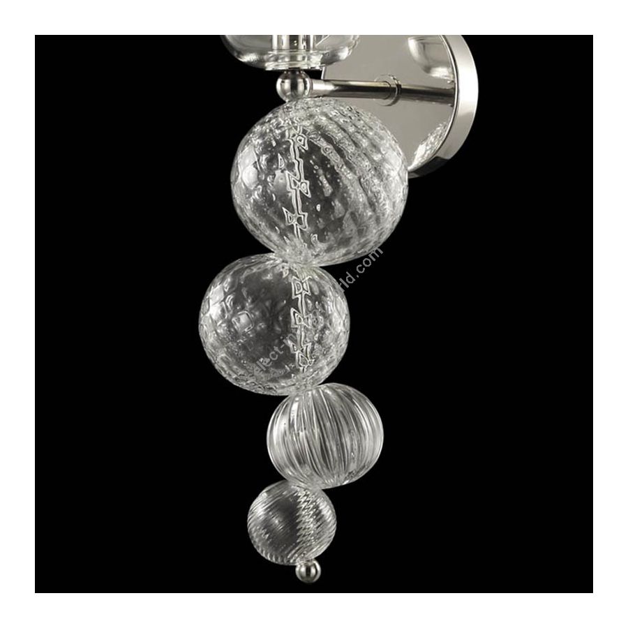 The source of light is positioned above the spheres, so that the light can pass through them and create beautiful glares on the glass surface. This is an elegant lighting work, made with high quality materials and refined techniques, but at the same time it is an ironic composition.