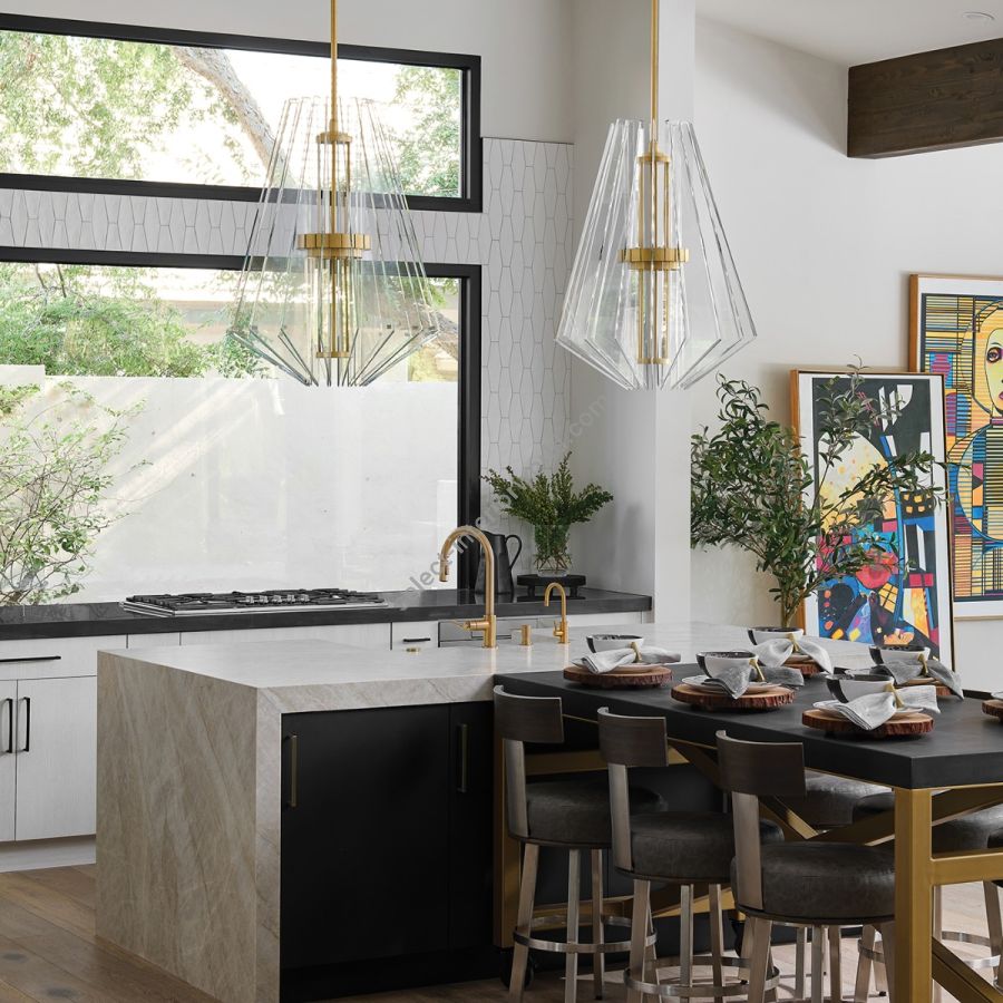 LED pendant featuring strikingly carved and arrayed crystal planes. Contemporary in form and silhouette, these sculptures of metal and light offer an ordered sense of complexity as they introduce crisp illumination, sparkle at every angle, and the color-infused prismatic brilliance of multi-faceted glass works. Features downlight on all configurations.