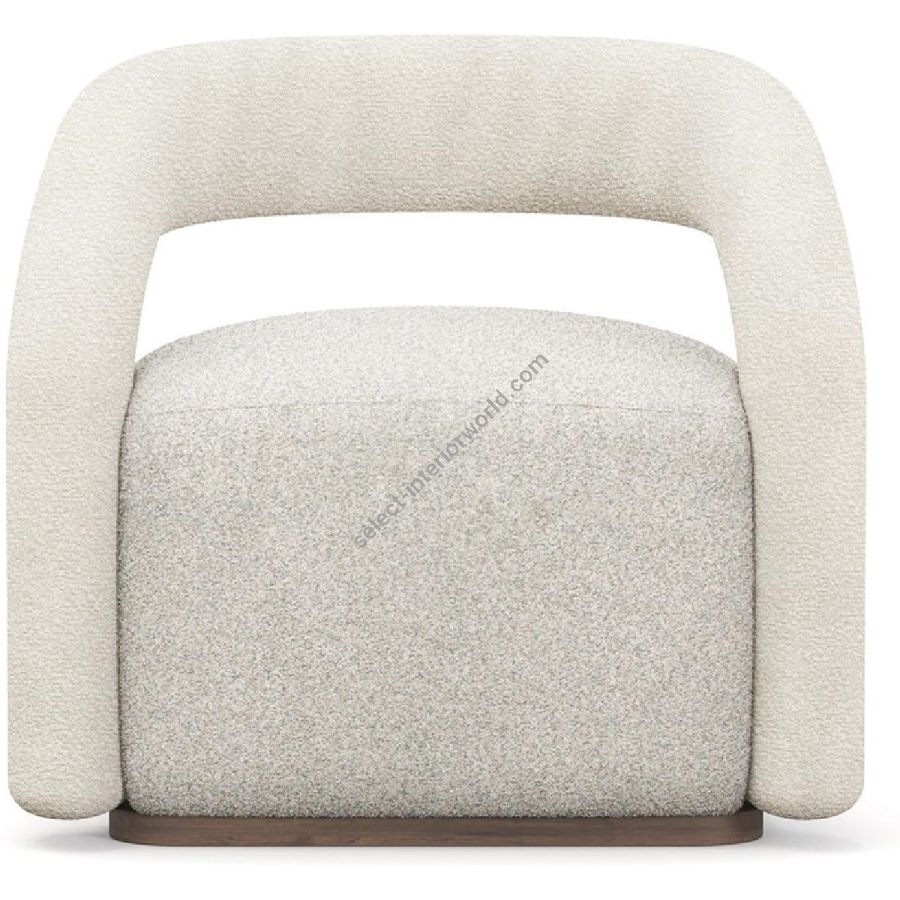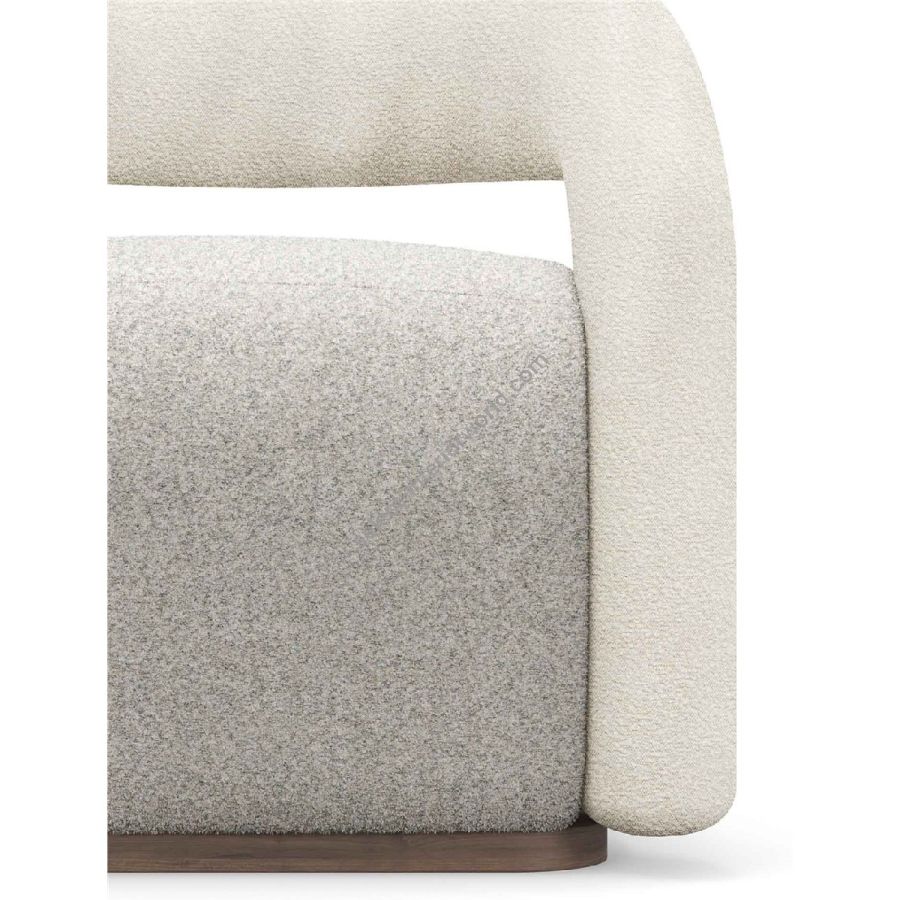 The distinctive curved arms and backrest, wrapped in boucle fabric, provide a tactile contrast to the smooth upholstery of the seat. The sturdy wooden base adds stability and a touch of natural elegance, making this armchair a versatile addition to any living space. Whether placed in a living room, bedroom, or stylish office, the Emma armchair enhances your decor with its sophisticated charm and comfortable design.
