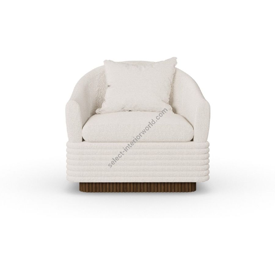 The armchair sits atop a ribbed walnut base, replacing the previous black timber design, bringing an added layer of warmth and natural beauty to the piece. The rich walnut grain and meticulously crafted ribbing provide a subtle yet striking textural contrast against the soft bouclé, enhancing the chair’s contemporary aesthetic while maintaining a timeless appeal.