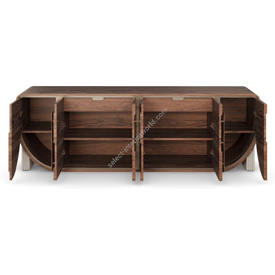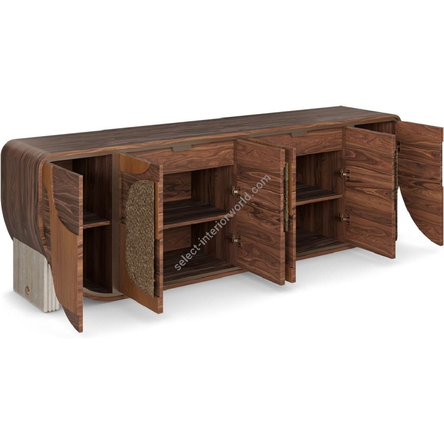 The Aurore sideboard is a true celebration of organic materials and bold design. Featuring a rich combination of walnut and cherry wood, its curved silhouette is accentuated by intricate wood paneling that creates a striking visual rhythm. The hammered brass handles, with their unique texture, add a sense of refinement, while the ribbed travertine legs provide a solid yet elegant foundation. Perfect for those who appreciate artistry and craftsmanship, the Aurore sideboard will instantly become the focal point of any space, adding a touch of modern luxury.