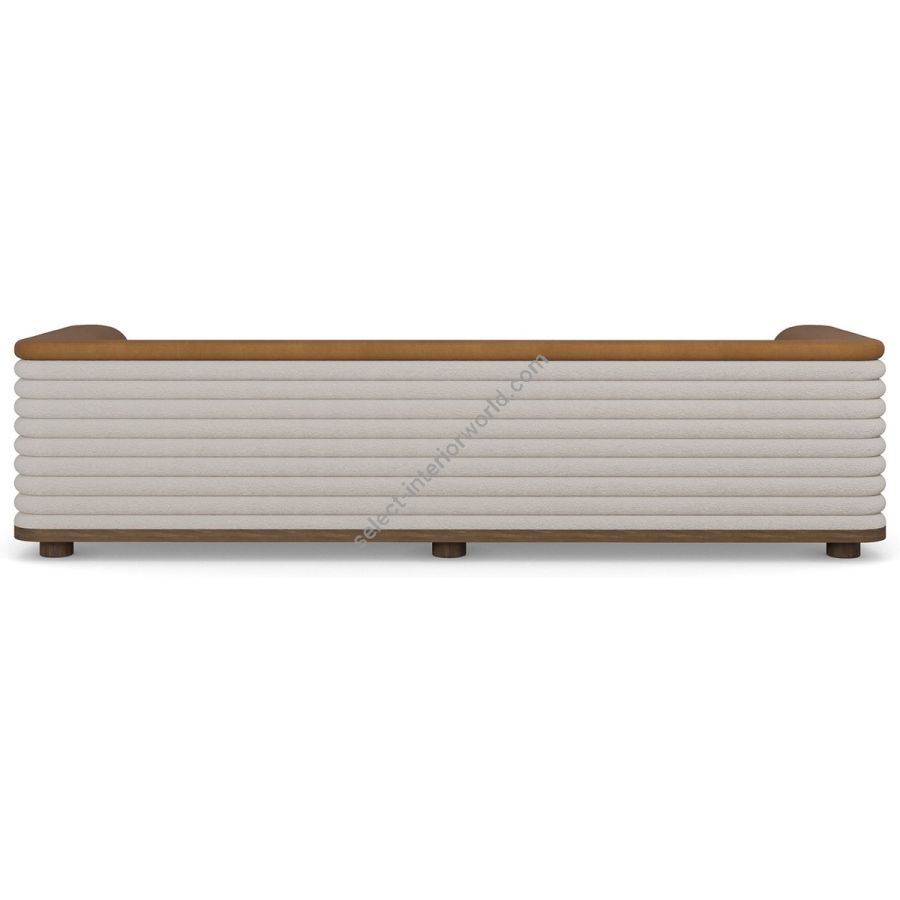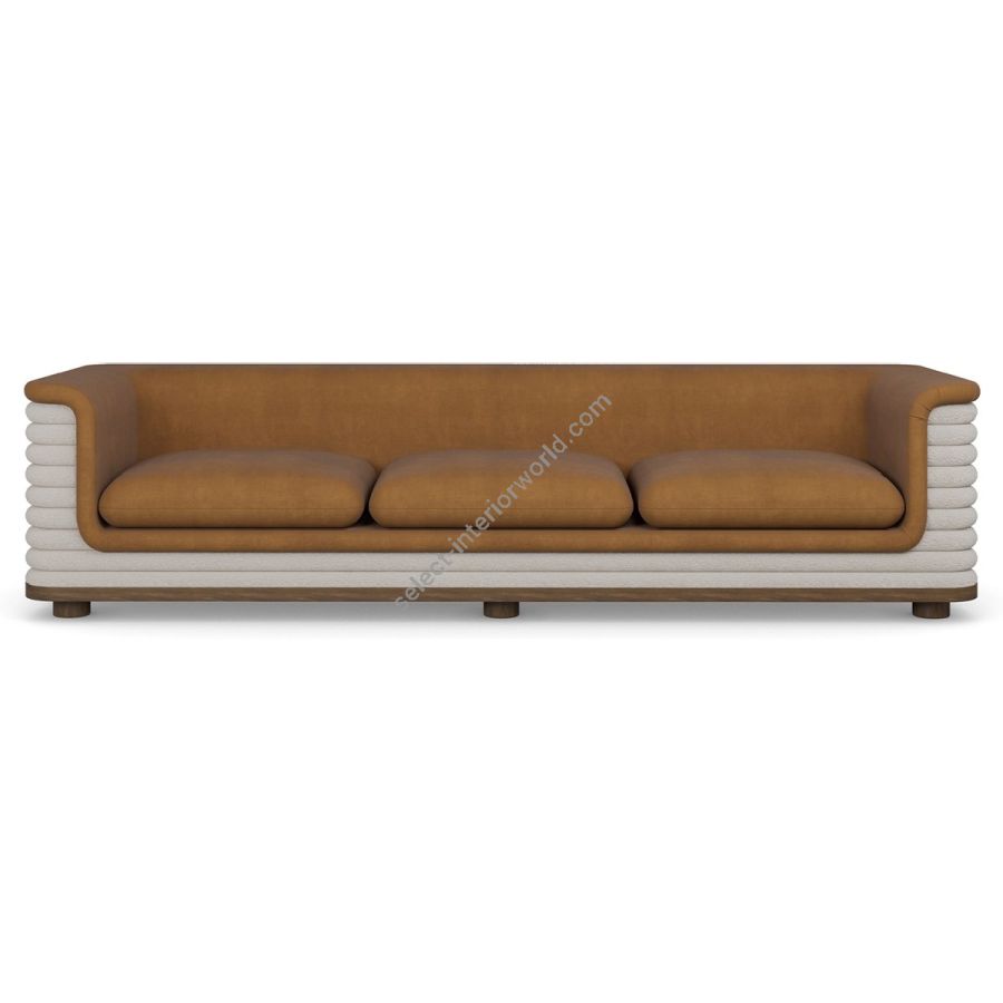 Nolita Harbour Céline Sofa, this elegantly designed piece combines the softness of boucle fabric with the lush texture of velvet, creating a sophisticated and inviting seating option for any home. The Céline sofa features a unique ribbed design on its exterior, wrapped in soft boucle fabric, while the interior seating area is upholstered in luxurious velvet. The two plush seat cushions and matching back pillows offer exceptional comfort and support.