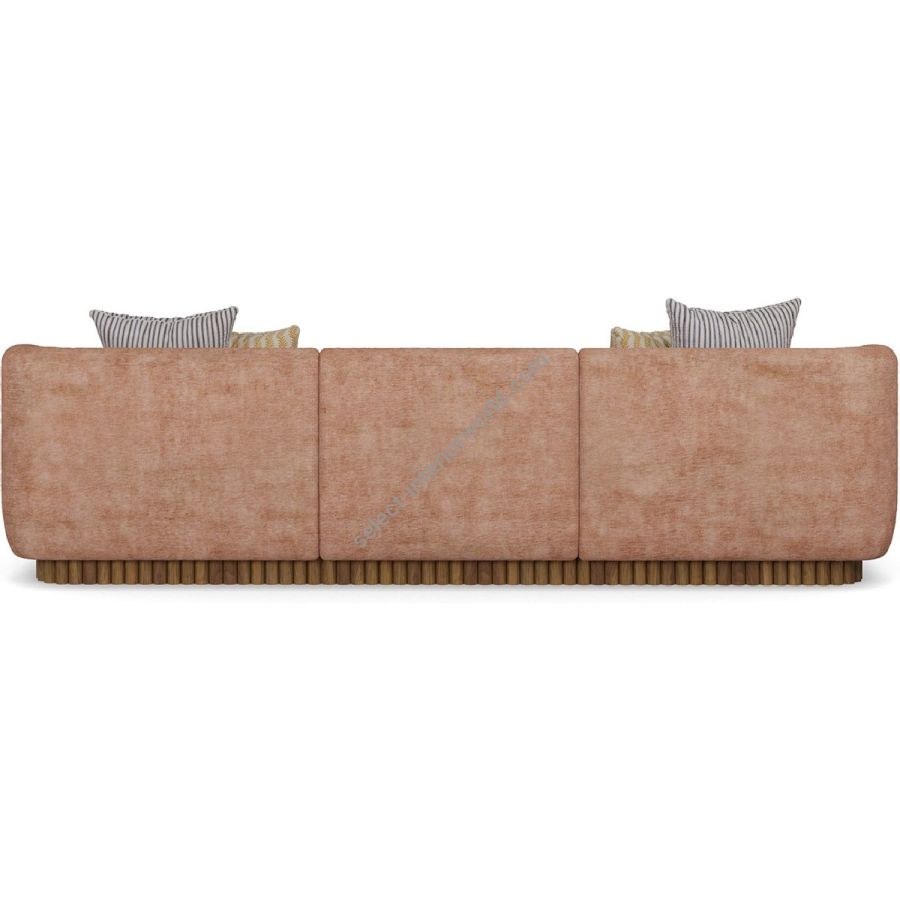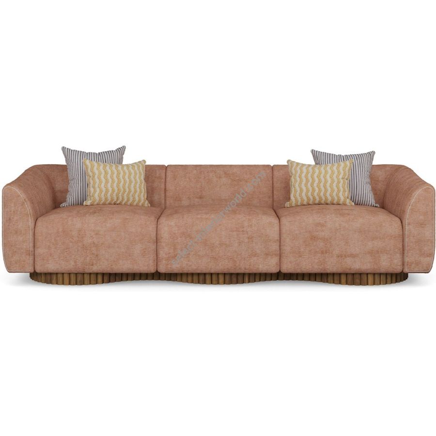 The sofa stands out with its distinctive ribbed walnut matte base, adding a touch of sophistication and natural beauty. This base not only enhances the sofa’s visual appeal but also provides a solid foundation for long-lasting use. Complementing the vibrant upholstery are soft, neutral-colored cushions that offer both contrast and an additional layer of comfort.