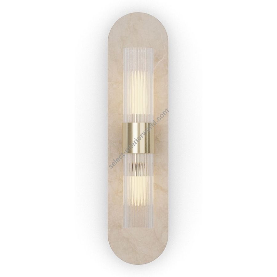 At the center, a polished brass fixture secures the dual-light design, while the fluted glass tubes create a stunning interplay of light and shadow. This ribbed glass detailing subtly diffuses the illumination, casting a warm, ambient glow that enhances the surrounding environment. The elongated form and rounded edges of the travertine structure contribute to its graceful, architectural appeal.