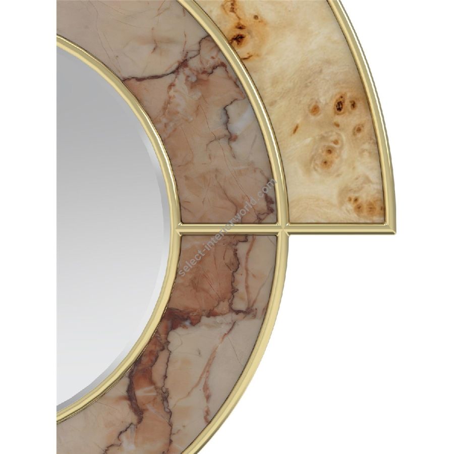 Sierra Mirror, an exquisite blend of artistry and function. This uniquely designed mirror features a captivating combination of burl wood and marble inlays, framed elegantly with brass accents. The semi-circular and rectangular segments surrounding the round mirror create a visually stunning effect, adding depth and sophistication to any room. Whether placed in an entryway, living room, or bedroom, the Sierra Mirror is sure to elevate the aesthetic appeal of your space.