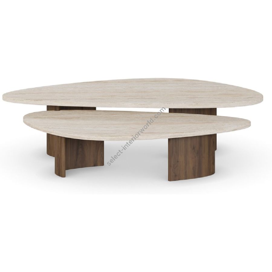 Agnes Coffee Table, a sophisticated fusion of natural travertine and rich walnut. This elegant table features a unique, dual-surface design that provides both aesthetic appeal and functional versatility. The smooth travertine tops rest gracefully on sturdy walnut bases, showcasing the harmonious blend of materials. Perfect for contemporary and classic interiors alike, the Agnes Coffee Table is a timeless addition to your living space.
