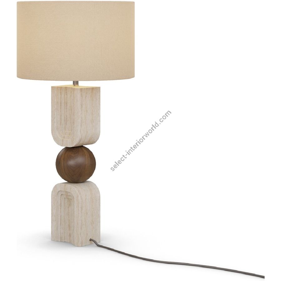 The Christoph table lamp is a sculptural masterpiece that harmonizes natural textures with bold geometric design. Crafted from travertine and walnut, its stacked base features two precisely carved travertine blocks, connected by a smooth walnut sphere that adds warmth and contrast. The interplay of organic stone and rich wood creates a striking balance between solidity and softness. Topped with a neutral fabric drum shade, the Christoph lamp diffuses a warm, ambient glow, making it an elegant addition to bedside tables, consoles, or reading nooks. A true statement piece, it seamlessly blends timeless craftsmanship with modern artistry.